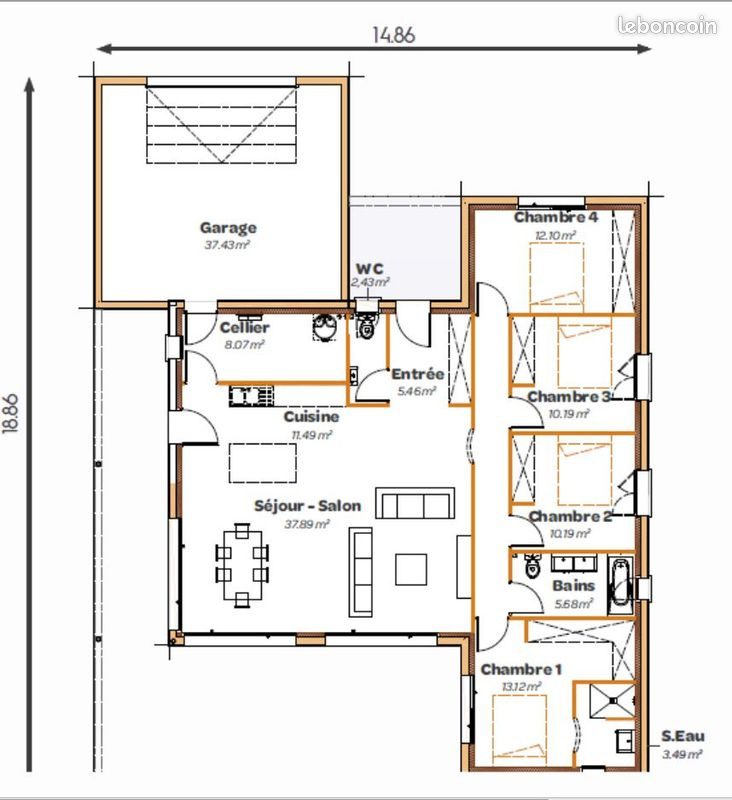 Découvrez notre modèle Malaga, une maison de plain-pied de 3 chambres, une salle d’eau, un bureau, une cuisine ouverte sur le séjour et un cellier attenant au garage.
