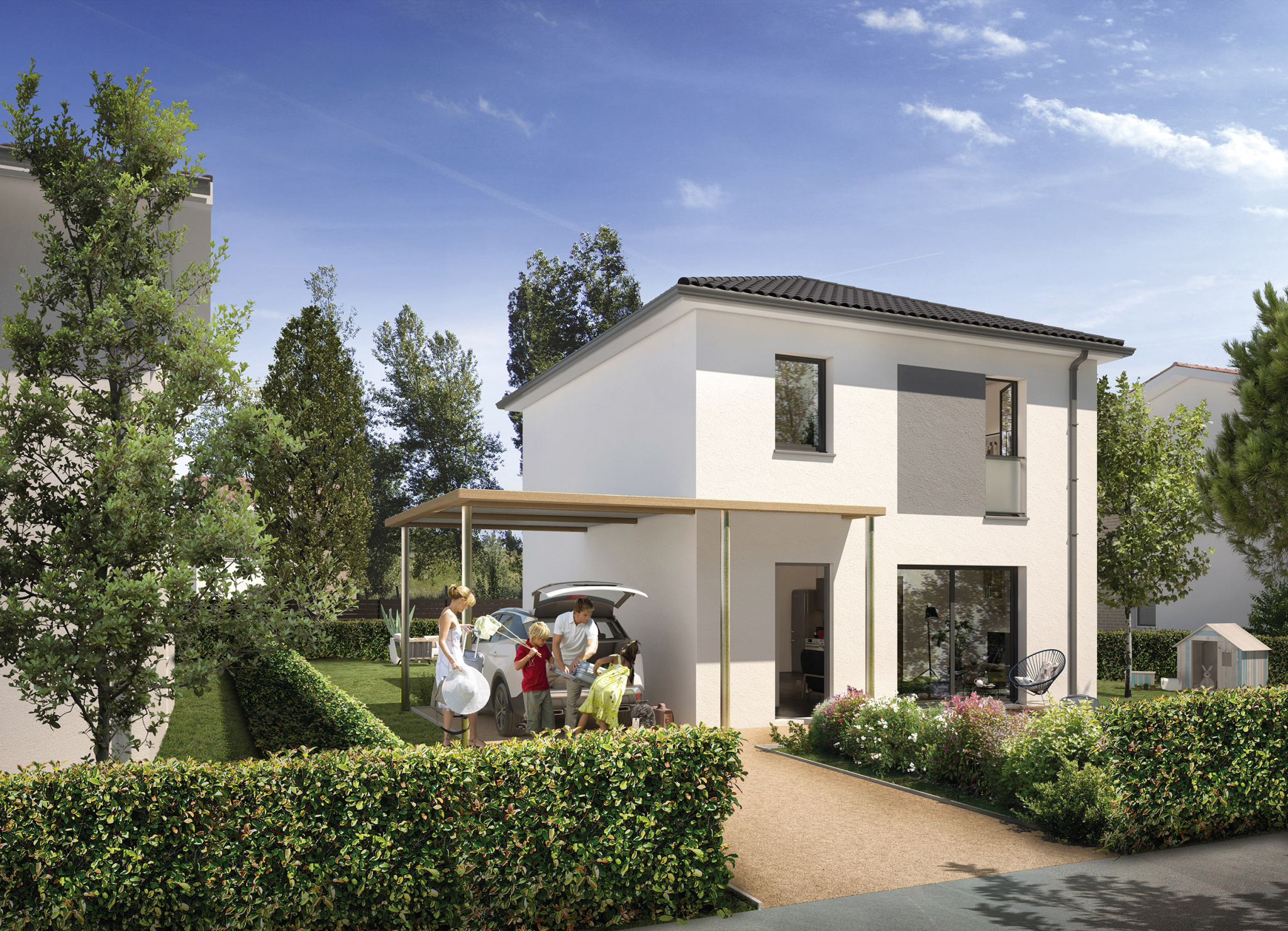 Modèle City 1 en 92 m2 avec 3 chambres, cuisine ouverte, volets roulants électriques, et chauffage en pompe à chaleur Split.